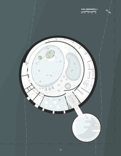 The ritual to enter the building starts at the shore, where a pathway leads the visitor towards the middle of the water. On the way, one arrives at a floating platform and takes off the shoes. With his barefoot, his journey continues. When he arrives at the enormous ring in the lake, he discovers that the outer edge of the ring transforms into steps, and descends into the water. As the visitor enters O through a single ramp. On his left, the horizon slowly rises and disappears. His feet now feel the warmth from the floor, and his eyes sees the steam sneaking in through the in-floor openings. He continues his journey.
